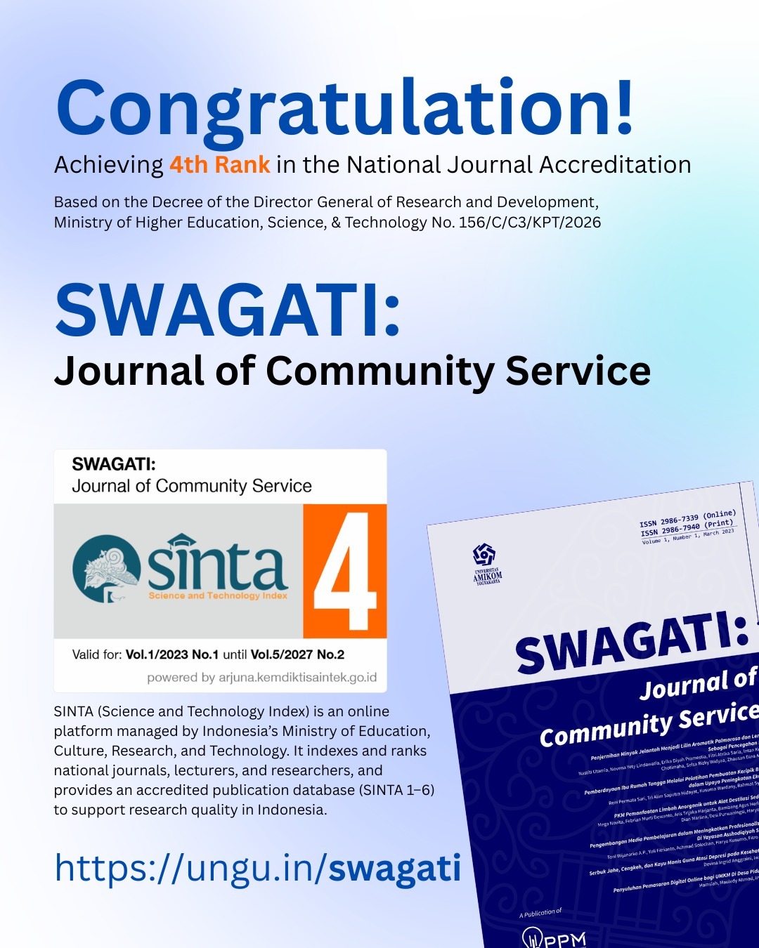 The SWAGATI: Journal of Community Service has achieved National Journal Accreditation (SINTA) Rank 4 based on the Decree of the Director General of Research and Development, Ministry of Higher Education, Science, and Technology No. 156/C/C3/KPT/2026. This milestone reflects its strong commitment to academic excellence and community engagement.
